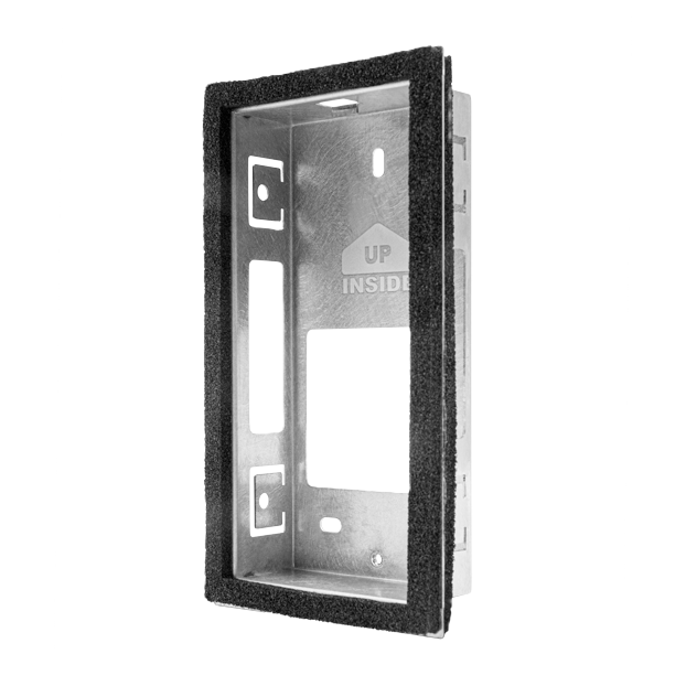 Obudowa do montażu podtynkowego wykonana ze stali nierdzewnej V2A, przeznaczona do estetycznego osadzenia urządzenia w ścianie. Pasuje wyłącznie do urządzeń kontroli dostępu DoorBird A1121 Flush-Mount oraz A1122 Flush-Mount IP Access Control Devices.