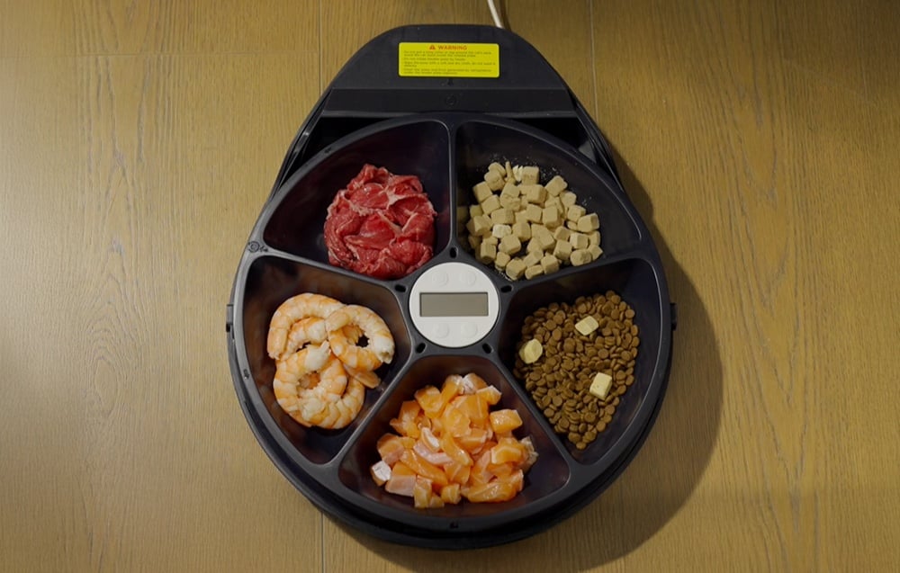 Każda z pięciu komór została wykonana z bezpiecznego, atestowanego tworzywa spożywczego, które można łatwo myć pod bieżącą wodą lub w zmywarce. Urządzenie pracuje cicho i stabilnie, dzięki czemu nie stresuje kota podczas jedzenia. Antypoślizgowe nóżki zapobiegają przesuwaniu się dozownika, a ekran sterujący został ukryty pod pokrywą, co chroni go przed przypadkowym uszkodzeniem i zapewnia estetyczny wygląd urządzenia.