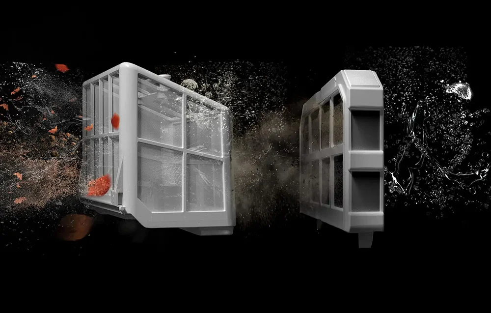 System 3D Adsorption łączy kosz filtracyjny 180 μm z ultra-drobną gąbką 40 ppi, co poprawia skuteczność wyłapywania zabrudzeń. Taka filtracja pomaga usuwać m.in. piasek, liście, gałązki, włosy, kurz, kamyki i glony, zwiększając klarowność wody.