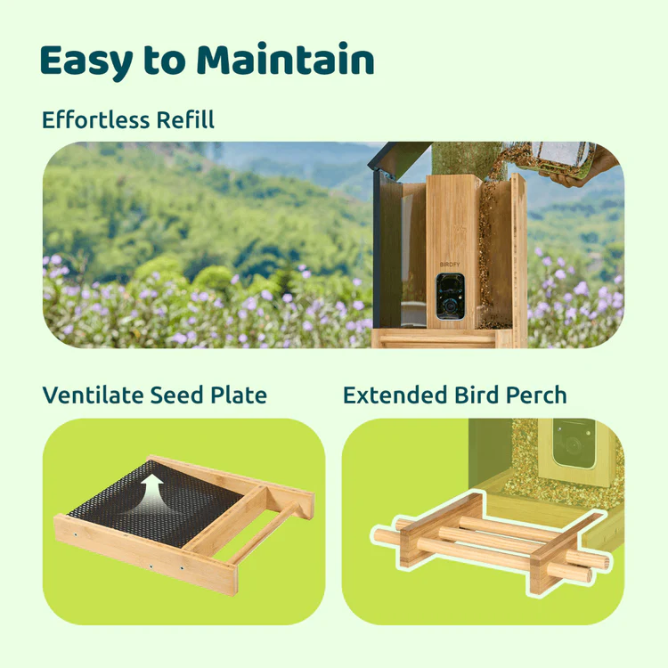 Karmnik ma pojemność aż 3,5 litra, co oznacza rzadsze uzupełnianie pokarmu. Demontowalna konstrukcja oraz metalowa tacka na nasiona ułatwiają czyszczenie, chroniąc pokarm przed pleśnią i wilgocią. To rozwiązanie zaprojektowane z myślą o higienie i komforcie użytkowania.