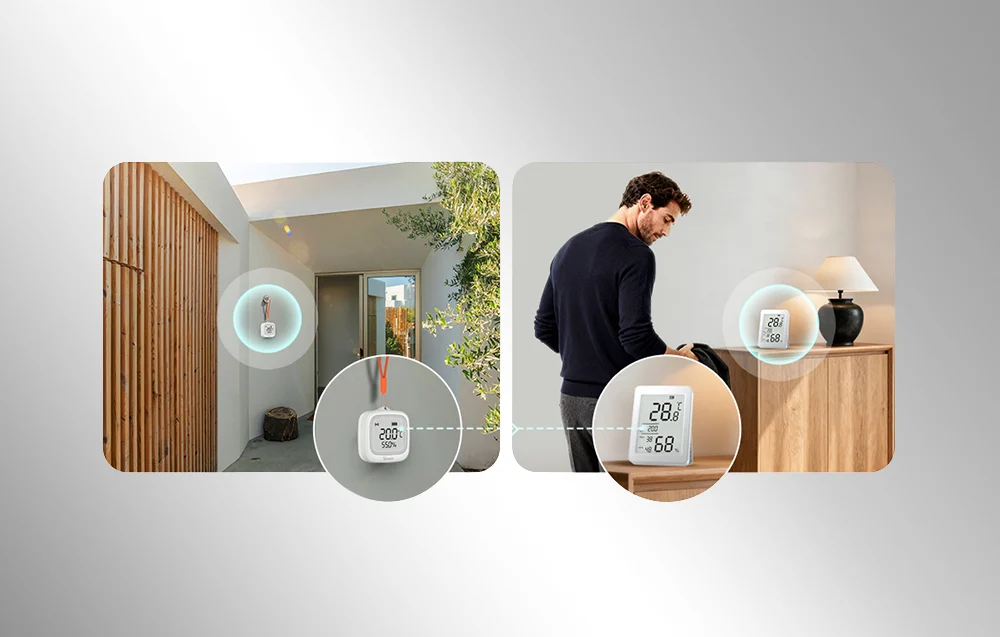 Jeśli nie masz jeszcze huba, czujnik nadal może być użyteczny jako proste narzędzie do monitoringu. W trybie Proximity bez huba połączysz się bezpośrednio ze smartfonem, żeby sprawdzić bieżące parametry, ustawić podstawowe opcje i przygotować urządzenie pod późniejszą rozbudowę systemu. Komunikacja odbywa się przez Bluetooth do podglądu, kalibracji i konfiguracji, więc możesz zmienić jednostki °C/°F, skorygować wskazania lub wyeksportować dane, gdy chcesz je dalej analizować.