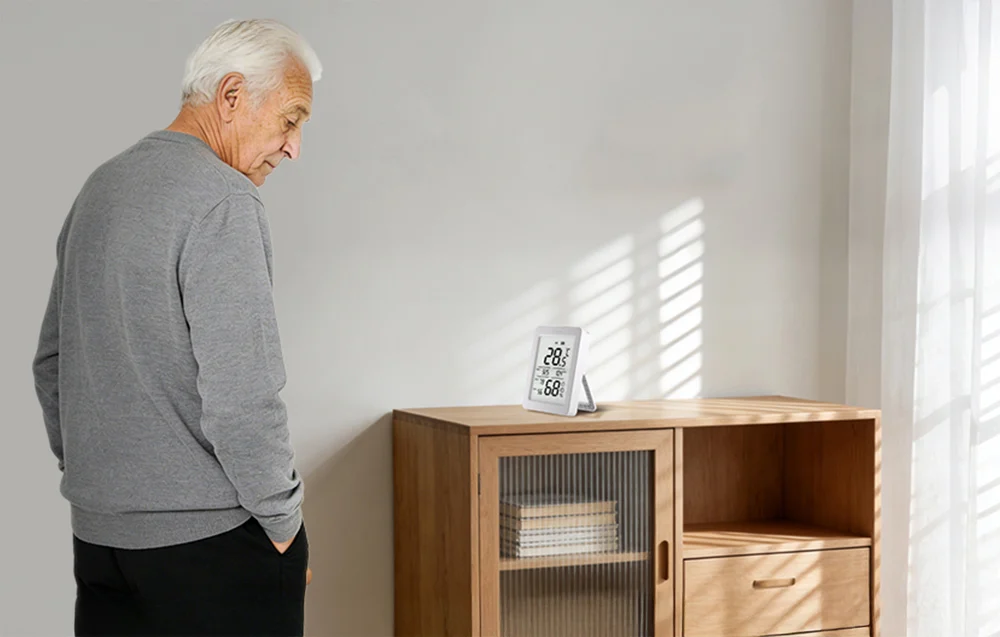 Kompaktowa forma i wytrzymałe tworzywo PC+ABS sprawiają, że czujnik łatwo dopasować do wnętrza, niezależnie od tego, czy stoi na półce, czy wisi na ścianie. Zasilanie rozwiązano prosto i praktycznie: dwie baterie AAA pozwalają na długą pracę bez częstej wymiany, a montaż nie wymaga kombinowania. Urządzenie nadaje się do sypialni, pokoju dziecka, szklarni, spiżarni, piwnicy, magazynu czy biura, bo wspiera szeroki zakres warunków: -20°C do 60°C oraz 5-95% RH, co daje pewność działania w codziennych i bardziej wymagających miejscach.
