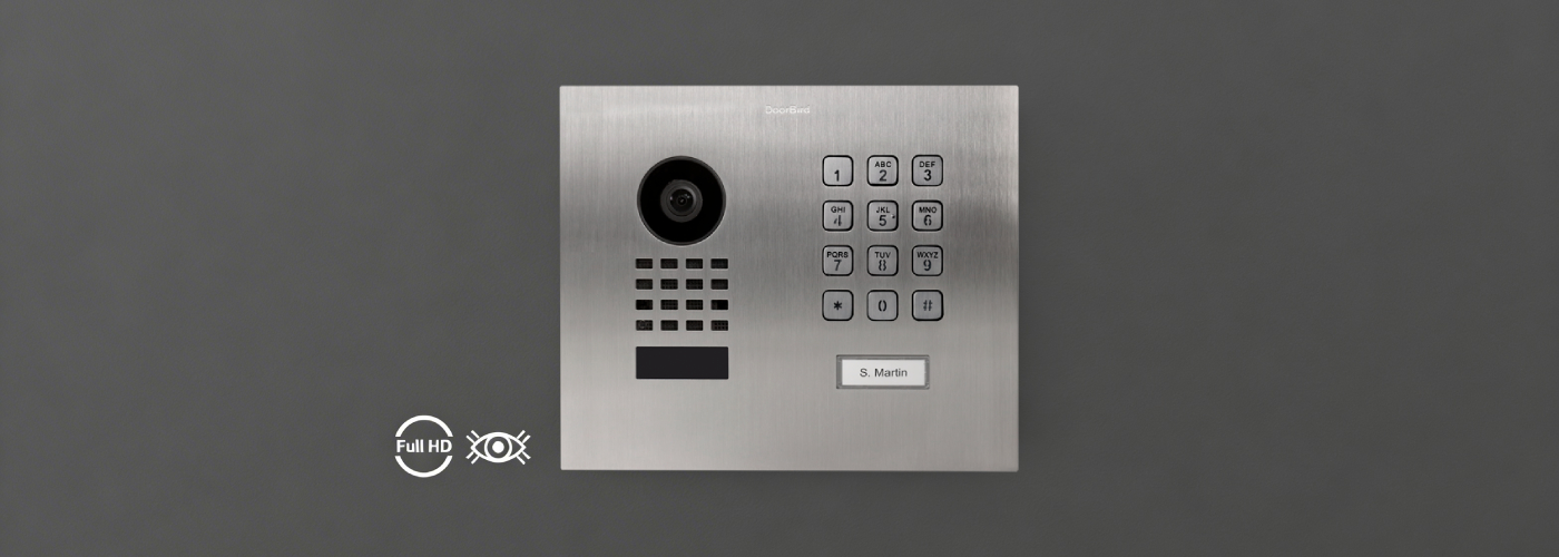 DoorBird D1101KH Modern Flush-mount to wideodomofon IP klasy premium dla domu jednorodzinnego lub firmy, wyposażony w 1 przycisk wywołania i solidną, podtynkową obudowę w zestawie. Front wykonano ze stali nierdzewnej V2A w wykończeniu szczotkowanym, dzięki czemu urządzenie wygląda elegancko i dobrze znosi intensywne użytkowanie przy wejściu.