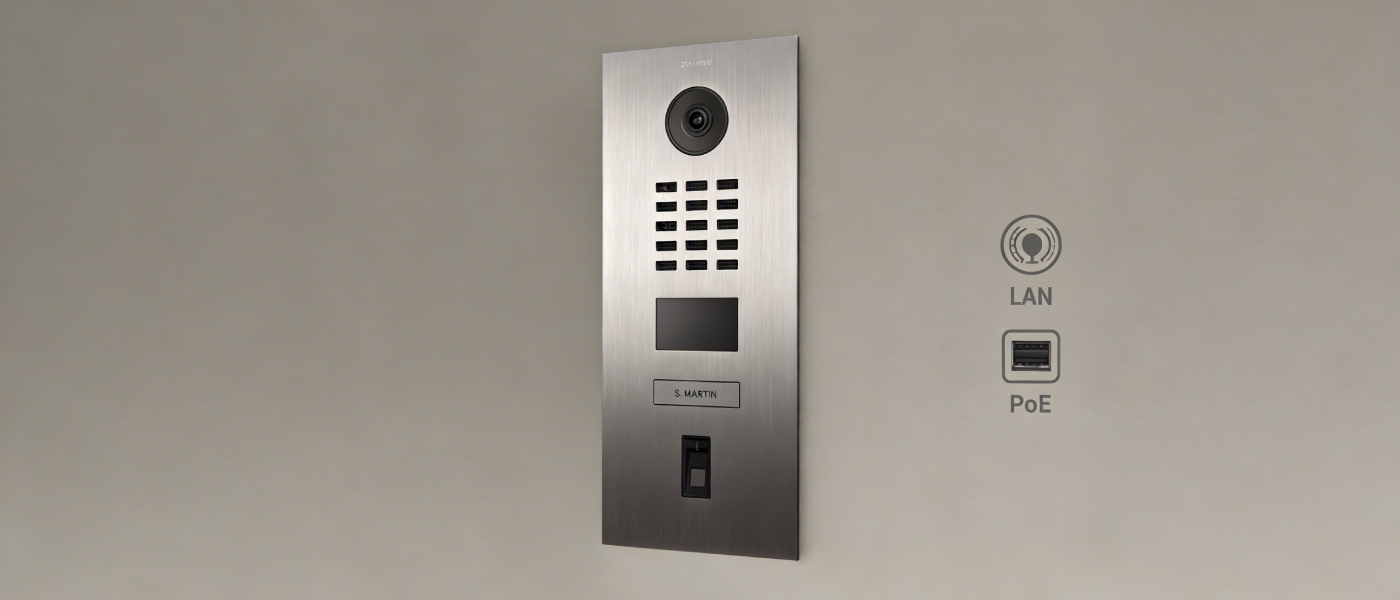D2101FV działa w oparciu o połączenie LAN i wspiera PoE, co upraszcza montaż i ogranicza liczbę przewodów. Urządzenie można podłączyć klasycznie kablem sieciowym, a gdy warunki instalacyjne są trudniejsze, pomocna jest możliwość połączenia przez dwużyłowy przewód dzwonkowy z użyciem 2-Wire Ethernet PoE Converter “DoorBird A1071” (dla zasilania PoE i transmisji danych). Efekt jest prosty: wideodomofon łatwiej wdrożyć zarówno w nowych inwestycjach, jak i w modernizowanych wejściach.