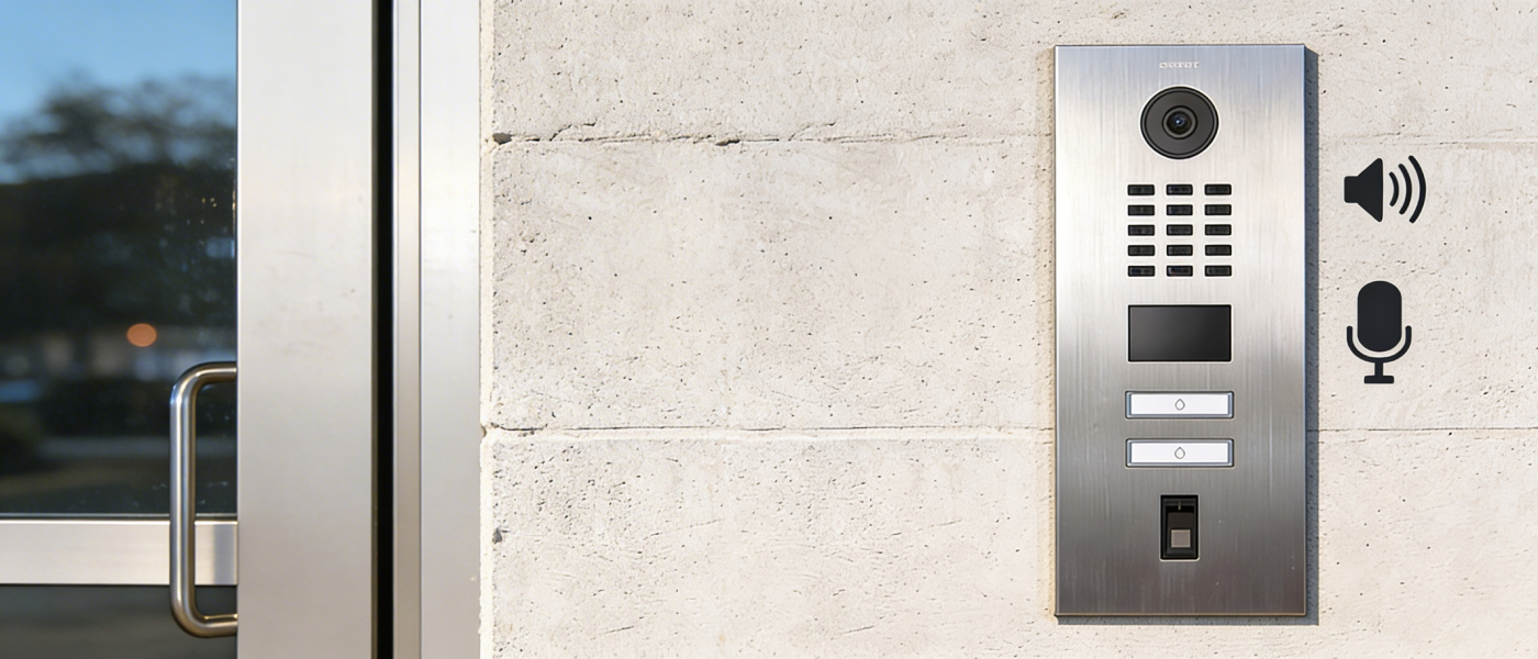 DoorBird D2102FV oferuje dwukierunkowe audio nastawione na komfort rozmowy, nie tylko na „działa lub nie działa”. Wbudowany mikrofon wspierają funkcje redukcji szumów i eliminacji echa (AEC, ANR), co poprawia zrozumiałość w hałaśliwym otoczeniu.