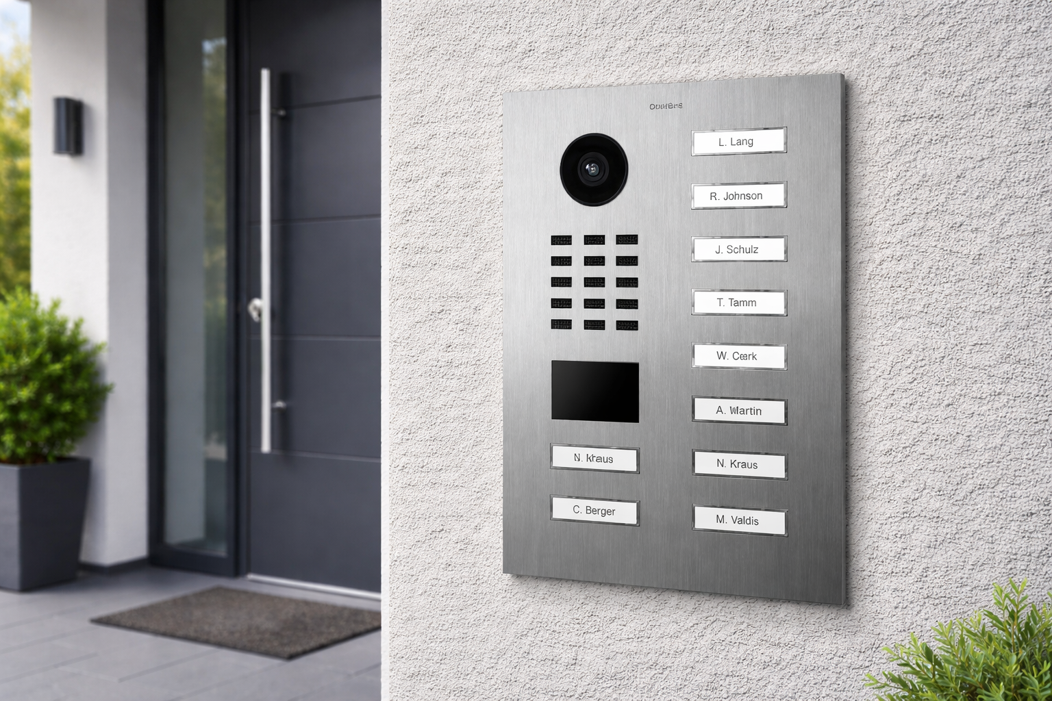 DoorBird D2110V to wideodomofon IP przeznaczony do obiektów wielolokalowych i środowisk biznesowych, w których liczy się płynna obsługa wejścia i pewne działanie każdego dnia. Urządzenie ma obudowę ze stali nierdzewnej V2A o szczotkowanym wykończeniu, dzięki czemu prezentuje się profesjonalnie i jest przygotowane na intensywną eksploatację. Panel oferuje 10 przycisków wywołania z podświetlanymi polami opisowymi, co poprawia czytelność po zmroku i ułatwia szybkie wybranie właściwego lokalu.