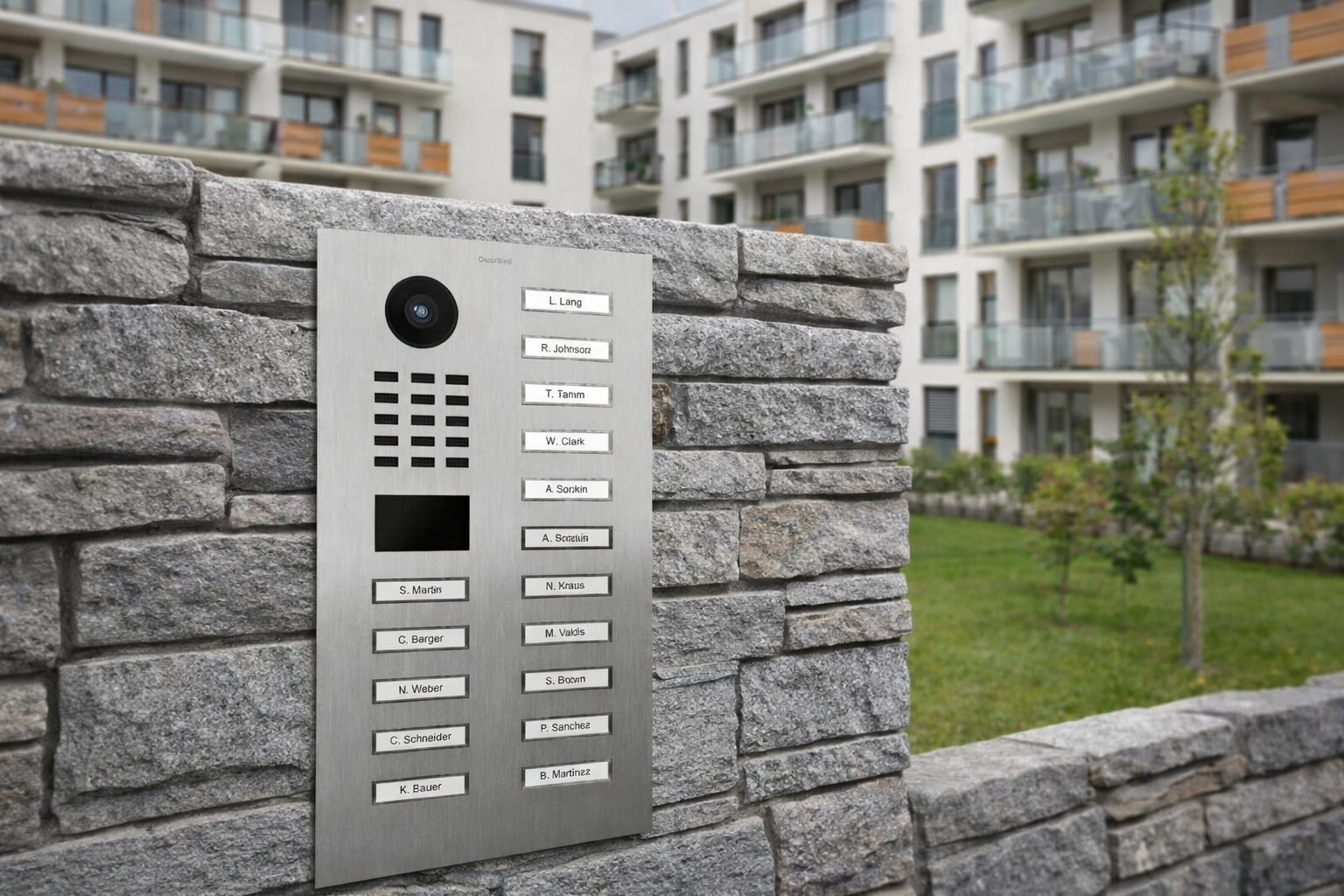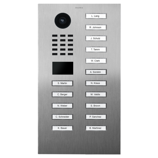 DoorBird D2116V to panel wideodomofonowy IP zaprojektowany do budynków wielolokalowych i środowisk biznesowych, w których liczy się niezawodność oraz wygodna obsługa strefy wejścia. Urządzenie ma front ze stali nierdzewnej V2A o szczotkowanym wykończeniu, co podkreśla profesjonalny wygląd i dobrze sprawdza się przy intensywnym użytkowaniu. Zastosowano 16 przycisków wywołania z podświetlanymi polami opisowymi, dzięki czemu panel pozostaje czytelny po zmroku i ułatwia szybkie odnalezienie właściwego lokalu.