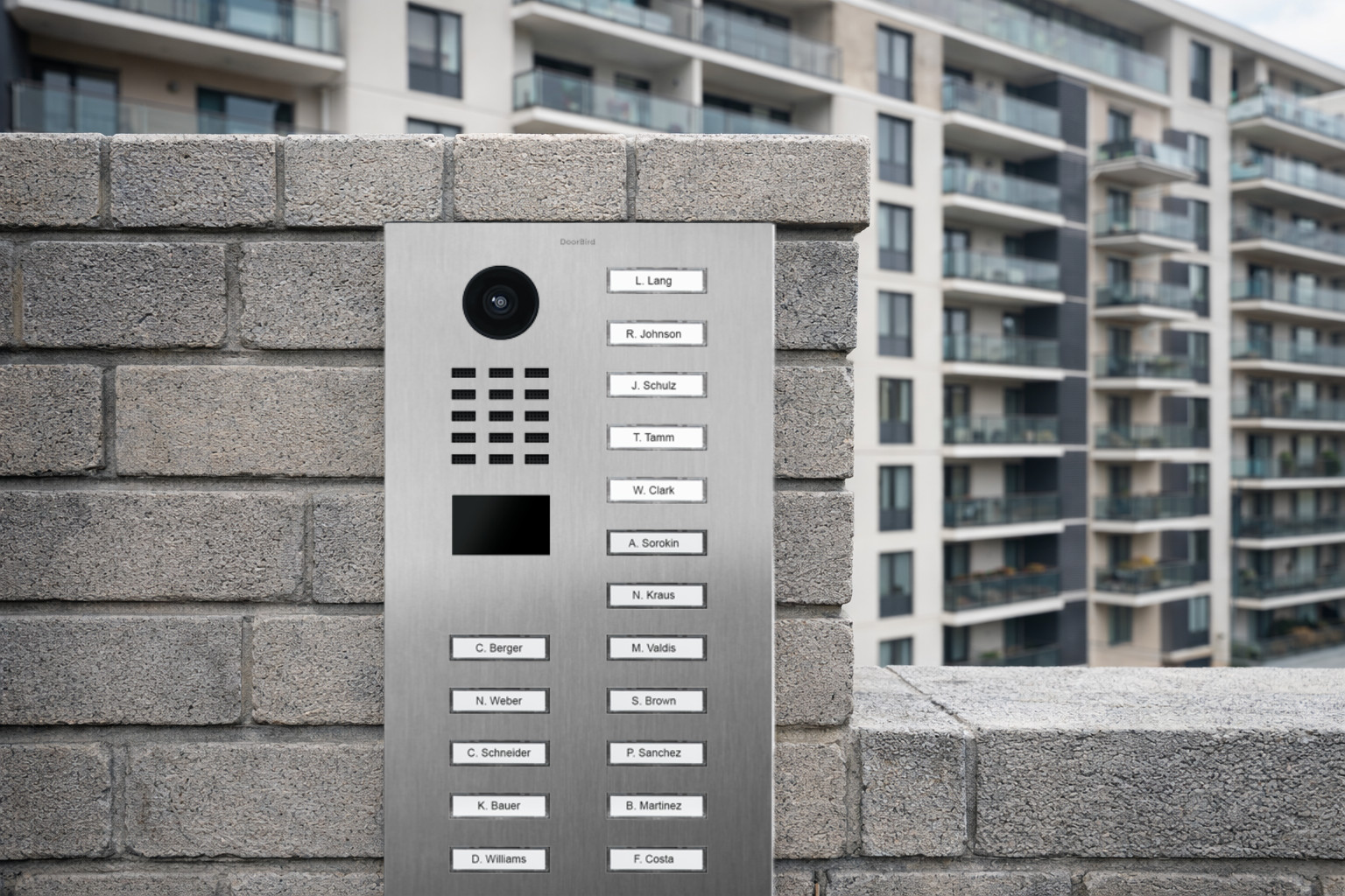 DoorBird D2117V to wideodomofon IP przygotowany do budynków wielolokalowych i obiektów firmowych, w których strefa wejścia pracuje intensywnie i ma pozostać czytelna dla użytkowników przez cały dzień. Front urządzenia wykonano ze stali nierdzewnej V2A o szczotkowanym wykończeniu, co dobrze wygląda przy wejściu i jednocześnie sprawdza się w codziennym użytkowaniu. Panel oferuje 17 przycisków wywołania z podświetlanymi polami opisowymi, dzięki czemu wybór właściwego lokalu jest prosty także po zmroku.