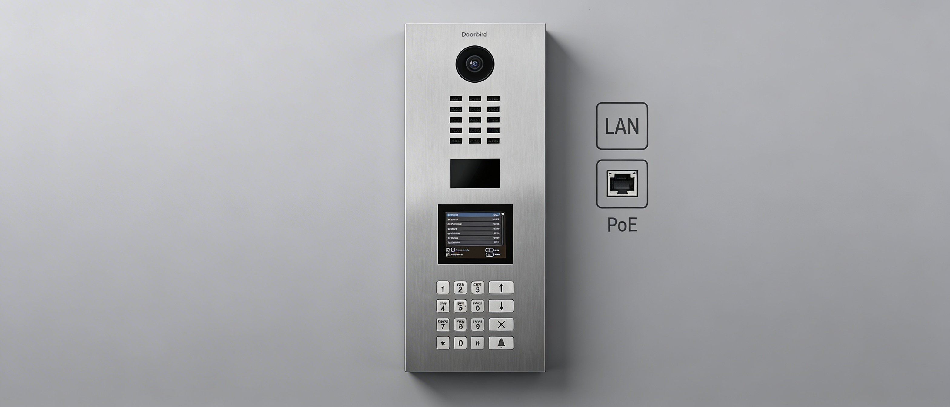 | Złącza | • RJ45, dla LAN/PoE • Bistabilny przekaźnik zatrzaskowy #1, maks. 24 V DC/AC, 1 A, np. do elektrozaczepu • Bistabilny przekaźnik zatrzaskowy #2, maks. 24 V DC/AC, 1 A, np. do elektrozaczepu • Wejście zewnętrzne dla zewnętrznego przycisku otwarcia drzwi • Wejście 15 V DC (+, -), maks. 15 W • Przekaźniki można rozszerzać / odłączać za pomocą DoorBird I/O Door Controller |
