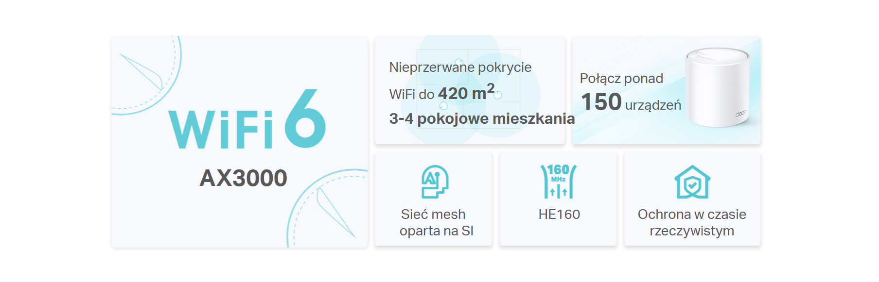 Deco X50 oferuje dwupasmowe Wi-Fi 6 (AX3000) o łącznej prędkości do 3,0 Gb/s: