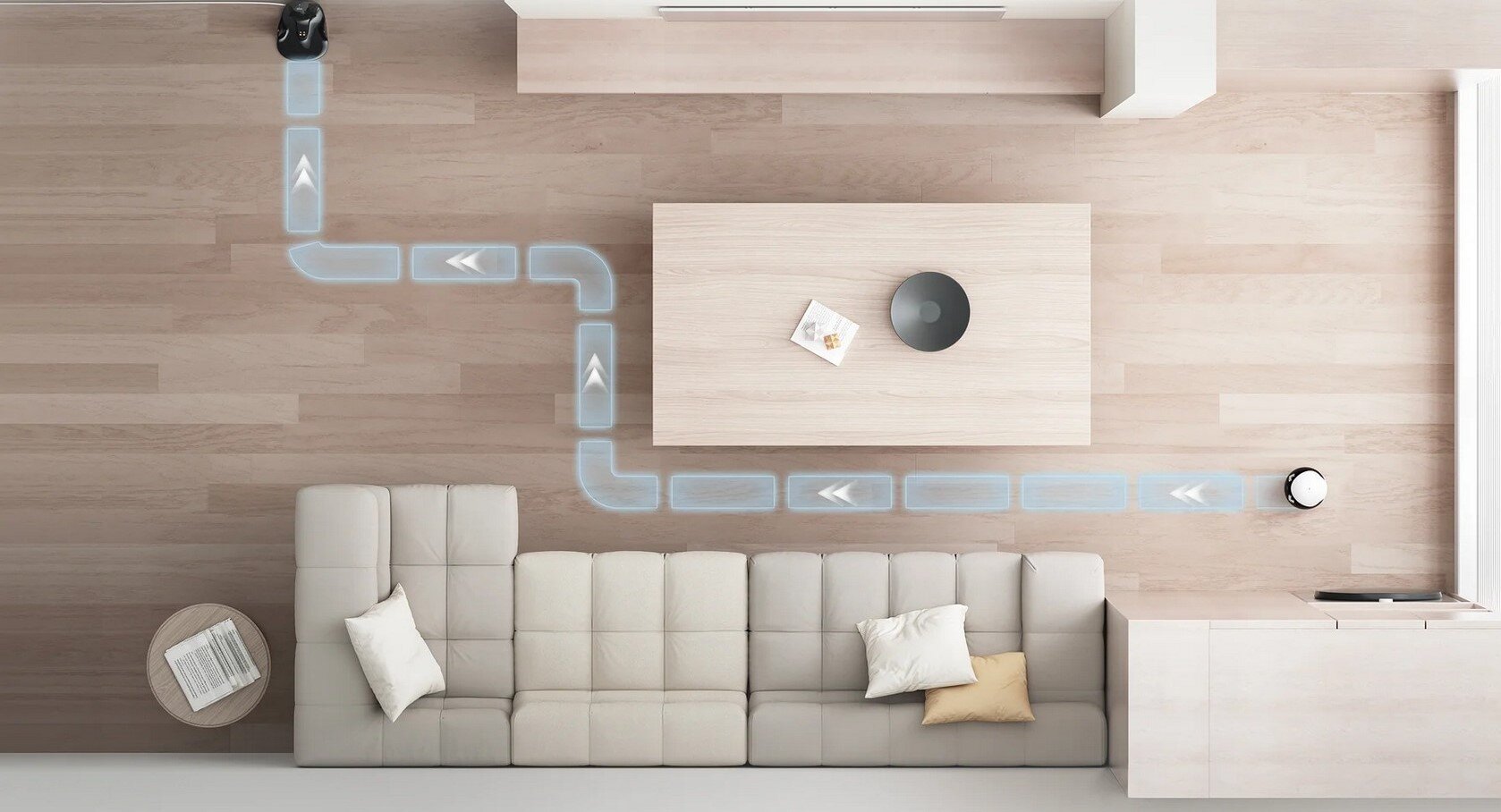 EBO Air 2 porusza się pewnie w każdym wnętrzu: aktywnie wykrywa meble, ściany i inne przeszkody, płynnie je omija i zapobiega zderzeniom. Czujniki krawędzi identyfikują stopnie i uskoki, więc robot nie spadnie ze schodów ani z podwyższeń, a jazda pozostaje stabilna nawet w złożonych układach pomieszczeń.