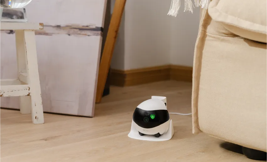 EBO SE, zadokowany w ładowarce, nieprzerwanie monitoruje przestrzeń przed sobą. Możesz włączyć 24-godzinny tryb zapisu w trybie stałym, aby lepiej chronić dom i rodzinę.