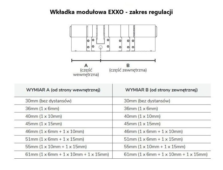 - regulowana długość od 30/30 do 61/61 mm daje dużą swobodę montażu i pozwala dopasować wkładkę do różnych grubości drzwi bez konieczności wymiany całego mechanizmu. To praktyczne rozwiązanie szczególnie wtedy, gdy zależy Ci na precyzyjnym montażu pod konkretny model zamka smart