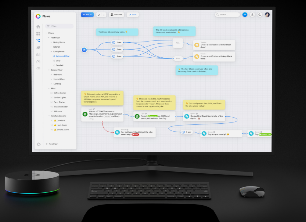 Advanced Flow daje możliwość tworzenia bardziej złożonych scenariuszy, łącząc wiele urządzeń i warunków w jeden spójny proces – idealny dla użytkowników, którzy chcą dokładnie dopasować zachowanie domu do swoich potrzeb.