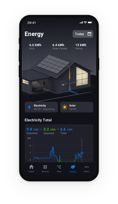 Zakładka Homey Energy zapewnia wgląd w zużycie i produkcję energii, prezentując dane w przejrzysty sposób. Możesz dzięki temu lepiej zrozumieć, które urządzenia pobierają najwięcej energii oraz tworzyć automatyzacje zwiększające efektywność energetyczną domu.
