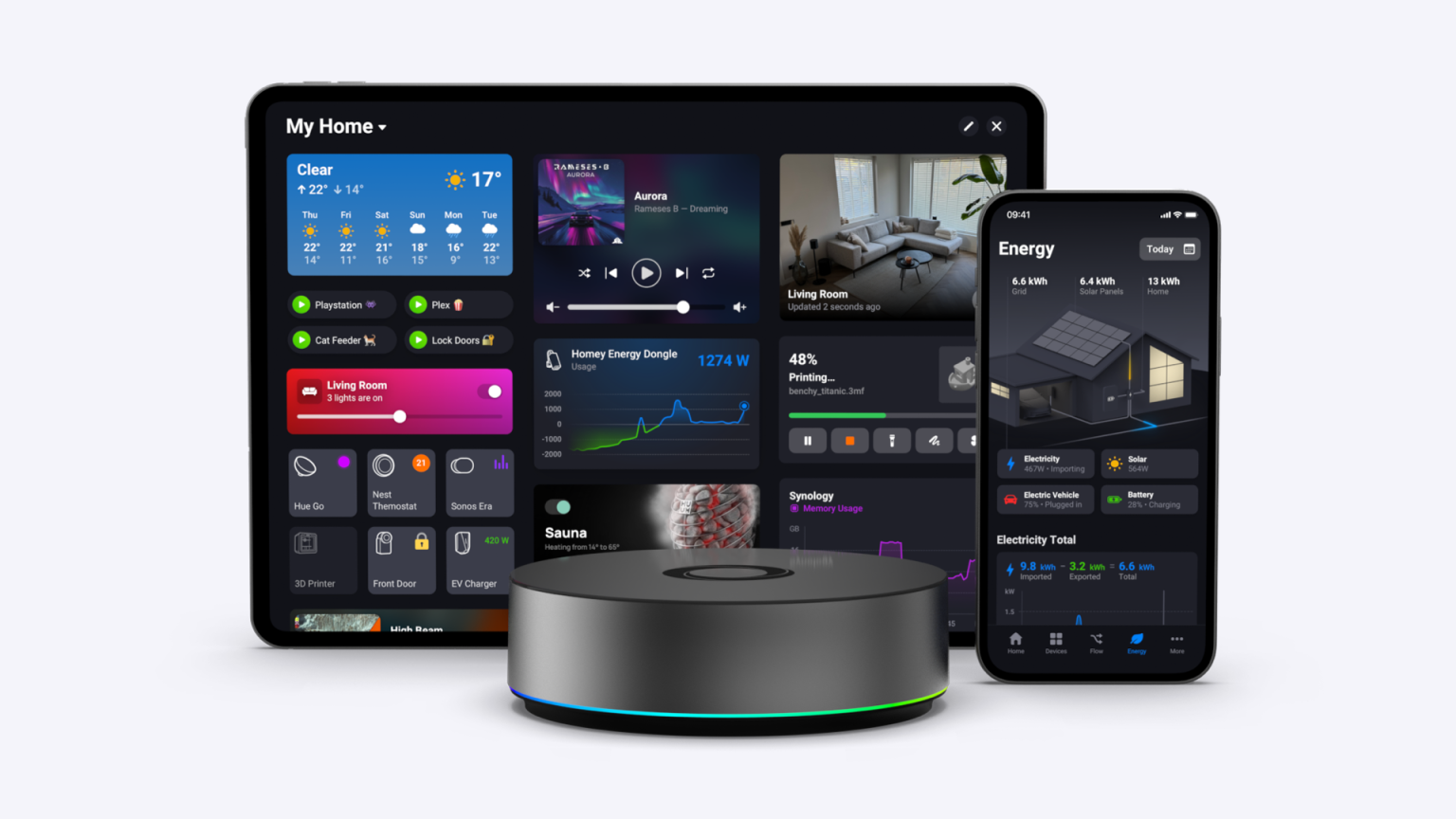 Po podłączeniu opcjonalnego Homey Energy Dongle możliwe jest zaawansowane monitorowanie oraz automatyczne zarządzanie zużyciem, co realnie pomaga redukować rachunki.