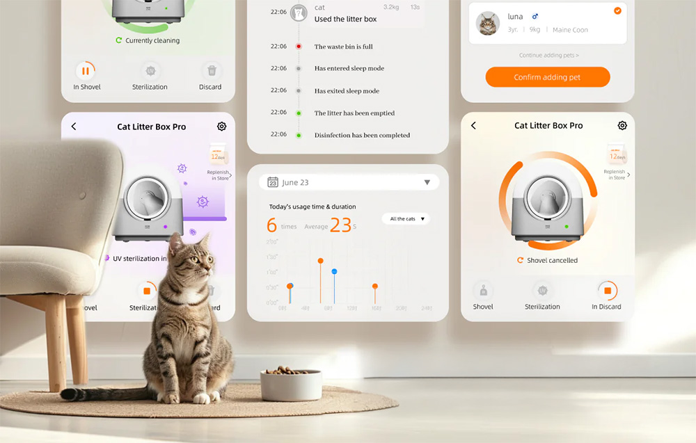 Dzięki aplikacji mobilnej HHOLove możesz śledzić częstotliwość wizyt kota w kuwecie, a także kontrolować jego masę ciała w czasie rzeczywistym. System identyfikuje poszczególne zwierzęta na podstawie ich wagi, dlatego świetnie nadaje się do domów, w których mieszka kilka kotów.