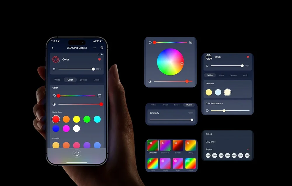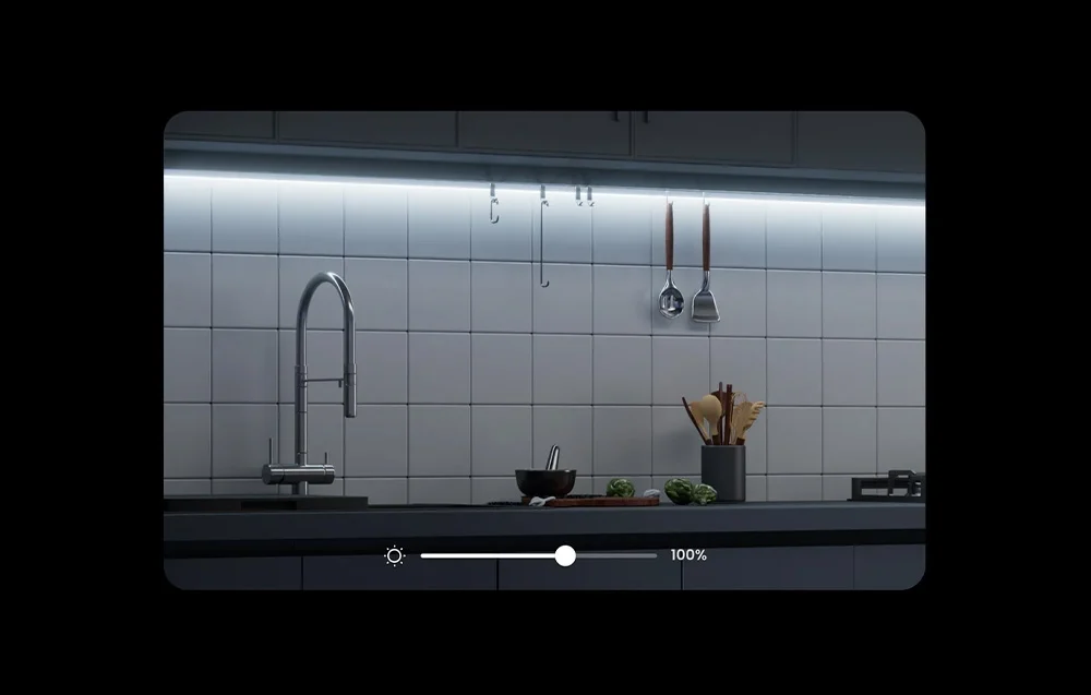 SwitchBot LED Strip Light 3 umożliwia ściemnianie w zakresie 1–100%, co daje pełną kontrolę nad intensywnością światła. W aplikacji znajdziesz zestaw gotowych scen – filmową, nocną czy relaksacyjną – a także opcję tworzenia własnych ustawień dopasowanych do nastroju i codziennych aktywności.