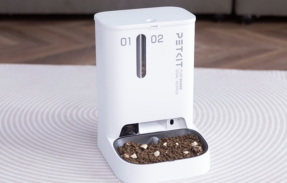 PetKit Yumshare Dual Hopper to nowoczesny dozownik karmy wyposażony w kamerę szerokokątną oraz mikrofon dwukierunkowy, które umożliwiają obserwowanie pupila, nagrywanie oraz interakcję z nim w czasie rzeczywistym. Kamera dodatkowo analizuje ilość jedzenia w misce i wstrzymuje kolejne porcje, jeśli karma nie została jeszcze zjedzona – to praktyczne rozwiązanie zapobiega marnowaniu pokarmu. Z pomocą aplikacji PETKIT właściciel może ustawić harmonogram posiłków – różny dla każdego dnia tygodnia – a także dostosować ich ilość i wielkość. Istnieje też opcja ręcznego wydania jedzenia przyciskiem na urządzeniu (zabezpieczonym przed przypadkowym naciśnięciem przez zwierzaka). Dozownik działa zarówno na zasilanie z gniazdka, jak i na baterie AAA w trybie awaryjnym.