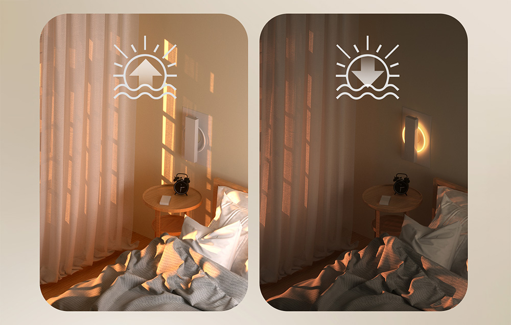 D1 oferuje tryb wschodu i zachodu słońca, pozwalający na automatyczne włączanie i wyłączanie światła zgodnie z naturalnym rytmem dnia. Dodatkowo, w aplikacji możesz zaplanować precyzyjne godziny i poziomy jasności, np. o 18:00 – 40%, o 19:00 – 100%, a wyłączenie o 6:00 rano