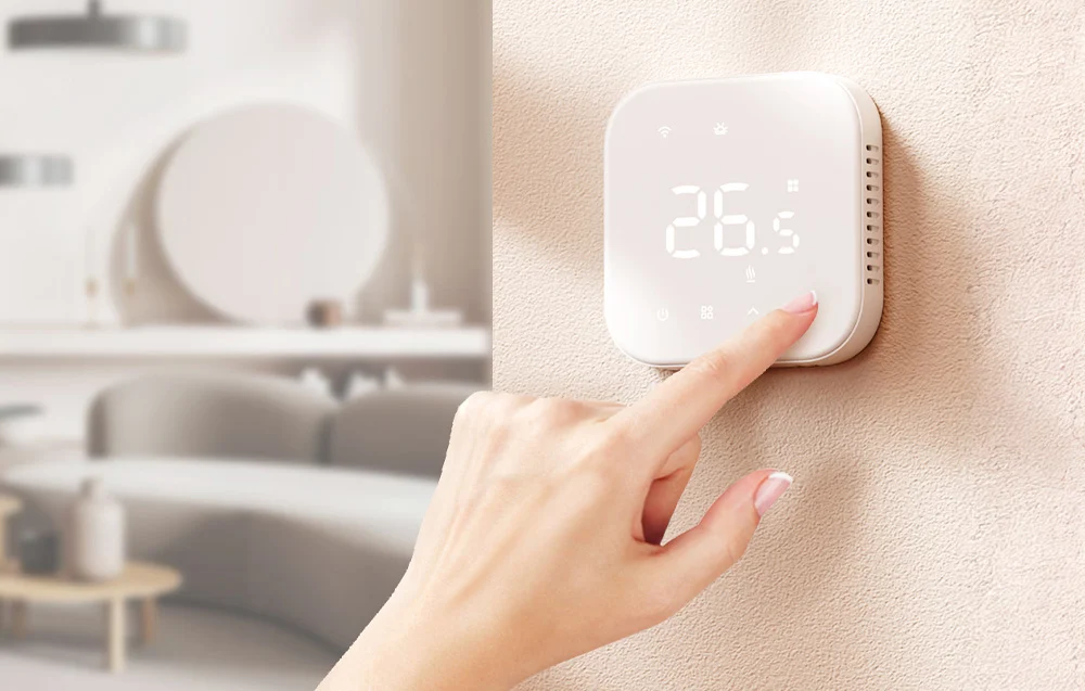 Meross MTS215BMA(EU) to ścienny termostat, który łączy klasyczną obsługę z wygodą smart, dzięki czemu sterujesz ogrzewaniem tak, jak Ci wygodnie i łatwiej pilnujesz, aby energia nie uciekała bez sensu.