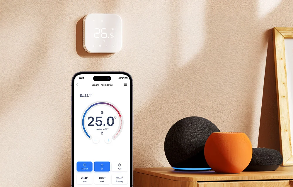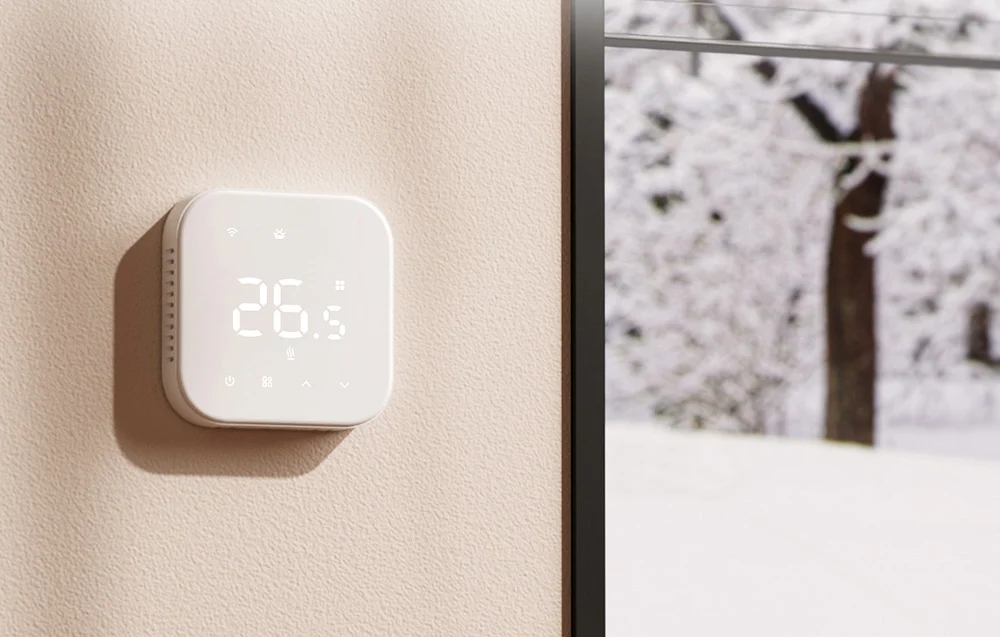 Łączność WiFi 2,4 GHz oraz Bluetooth Low Energy ułatwia konfigurację i codzienną obsługę, dzięki czemu pierwsze uruchomienie jest prostsze i szybciej przechodzisz do ustawień. Termostat możesz włączyć w automatyzacje, aby ogrzewanie współgrało z Twoimi scenami smart home.