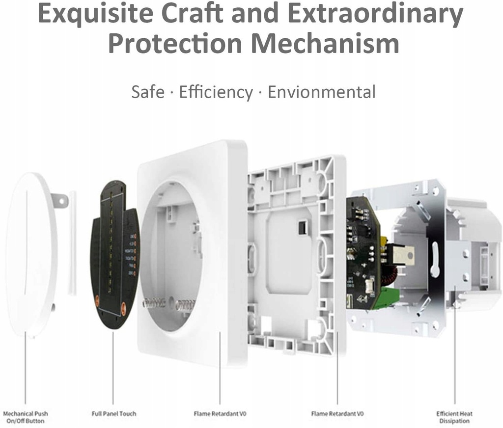 Włącznik został wykonany z wysokiej jakości materiałów, dzięki czemu prezentuje się stylowo na ścianie, a dodatkowo zapewnia długotrwałą i stabilną pracę. Minimalistyczny design sprawia, że pasuje do nowoczesnych i klasycznych wnętrz.