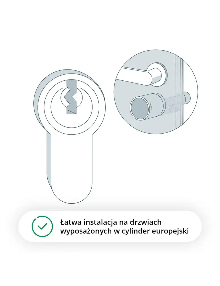 | Kompatybilność drzwi | Drzwi z cylindrem europejskim o grubości od 40 mm do 100 mm (z zestawami przedłużającymi 35 mm i 40 mm w zestawie) |