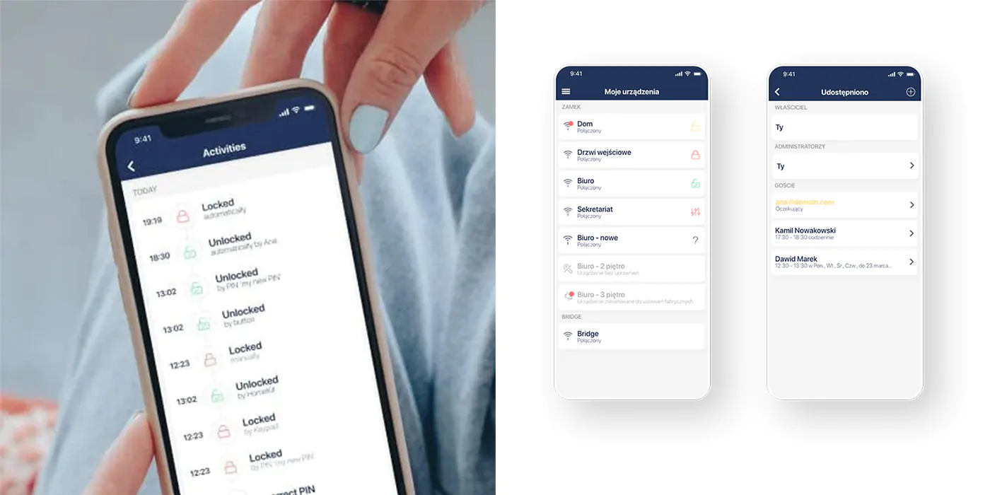 Aplikacja ułatwia także zarządzanie dostępami, dzięki czemu zyskujesz wygodne nadawanie uprawnień użytkownikom oraz kontrolę nad tym, kto i kiedy korzystał z zamka. W efekcie masz bezpieczeństwo i porządek niezależnie od tego, gdzie akurat jesteś.