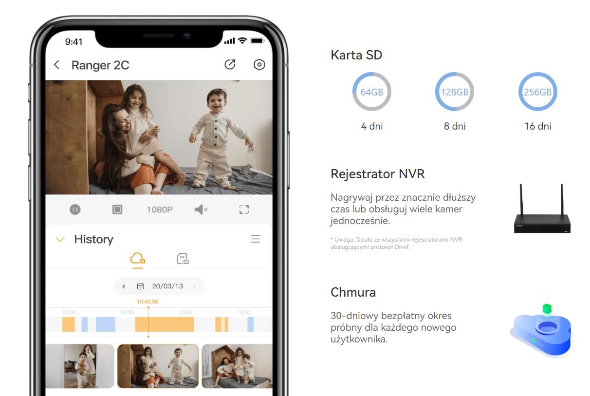Do przechowywania materiału możesz wykorzystać kilka rozwiązań, w tym zapis na karcie SD, rejestrator NVR albo chmurę, zależnie od tego, jak chcesz archiwizować nagrania. Dodatkowo kompatybilność z protokołem ONVIF ułatwia integrację z wybranymi systemami, a chmura z 30-dniowym bezpłatnym okresem próbnym pozwala przetestować zdalne zarządzanie i dostęp do zapisów.
