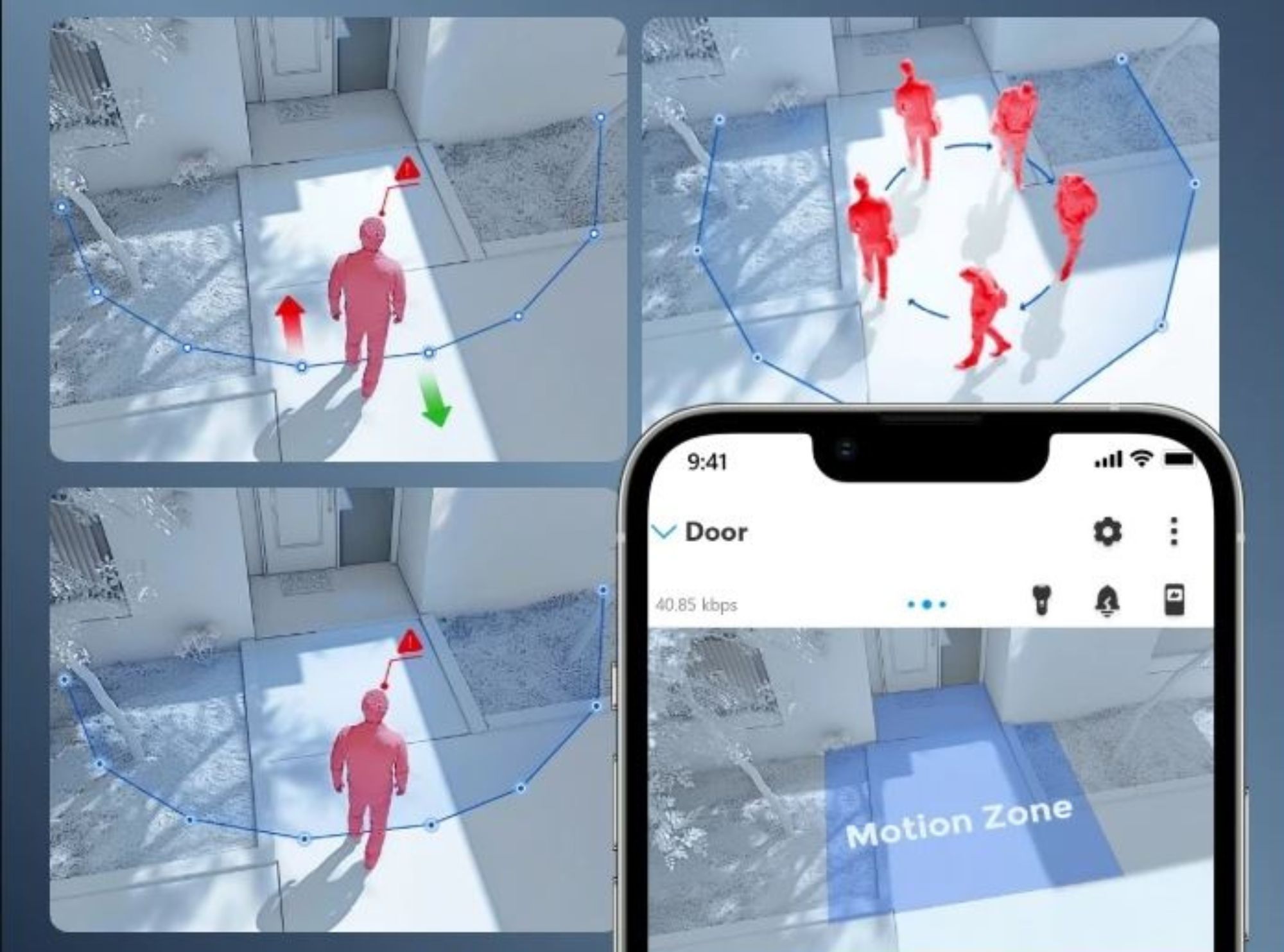 Model oferuje funkcje ochrony perymetru, które pomagają szybciej wyłapać podejrzane zachowania w określonych miejscach. Dostępne są alerty przekroczenia linii, wtargnięcia do strefy oraz przebywania w strefie, więc system może natychmiast informować o wejściu na teren zastrzeżony, przekroczeniu ogrodzenia lub zbyt długim przebywaniu w wybranym obszarze.
