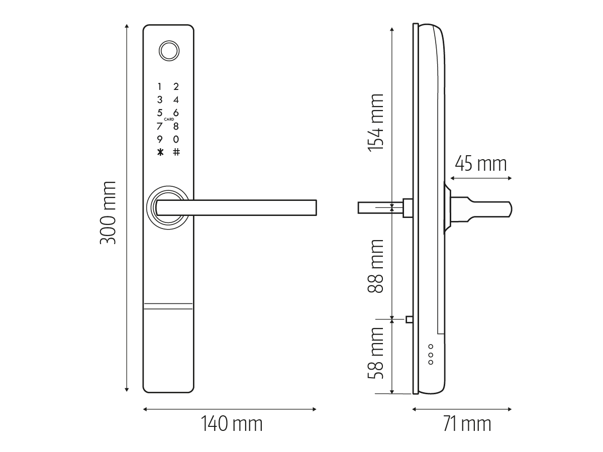 Kontroler dostępu można zamontować zarówno na zewnątrz, jak i wewnątrz pomieszczeń, w drzwiach otwieranych w lewo lub w prawo. Uniwersalny rozstaw śrub umożliwia wykorzystanie istniejącego zamka wąskoprofilowego, co czyni instalację prostą i szybką.