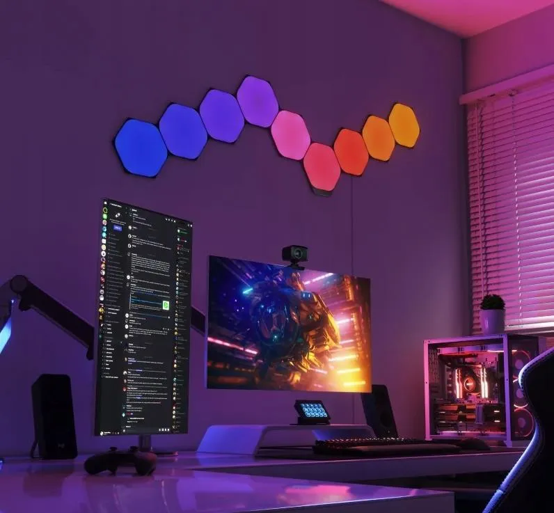 Nowa edycja Nanoleaf Shapes zachwyca – matowe czarne wykończenie w połączeniu z podświetleniem sprawia, że całość wygląda niezwykle nowocześnie i elegancko. To rozwiązanie, które natychmiast odmienia charakter przestrzeni.