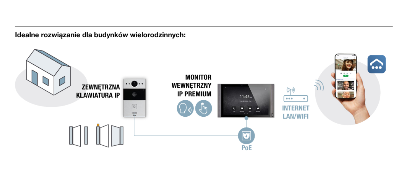 MyBell IP Premium sprawdza się w budynkach wielorodzinnych, bo ułatwia codzienną obsługę wielu mieszkań i użytkowników, oferując wygodny podgląd oraz komunikację na dużym ekranie. Dodatkowo obsługa standardów SIP i zarządzanie przez sieć web upraszczają integrację z infrastrukturą obiektu oraz późniejszą konfigurację i serwis.