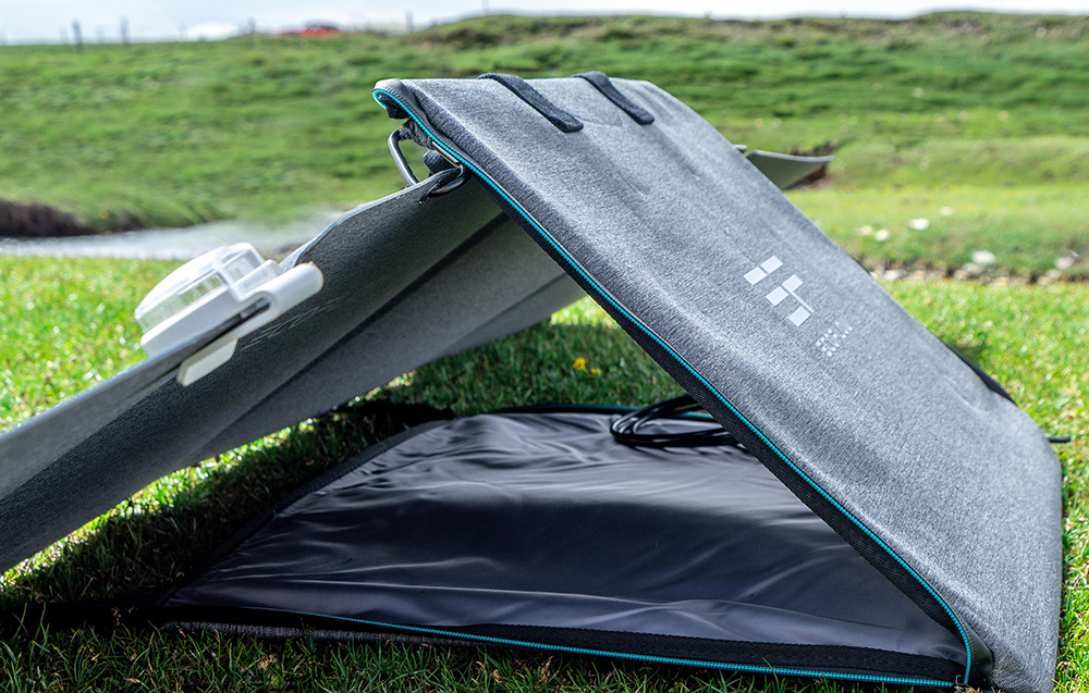 Panele EcoFlow można bezpiecznie przenosić dzięki specjalnym torbom transportowym, które jednocześnie pełnią funkcję regulowanej podstawki. Pozwalają one na ustawienie paneli pod kątem od 0° do 180°, co umożliwia precyzyjne dopasowanie ich pozycji do aktualnego położenia słońca i maksymalizację wydajności energetycznej.