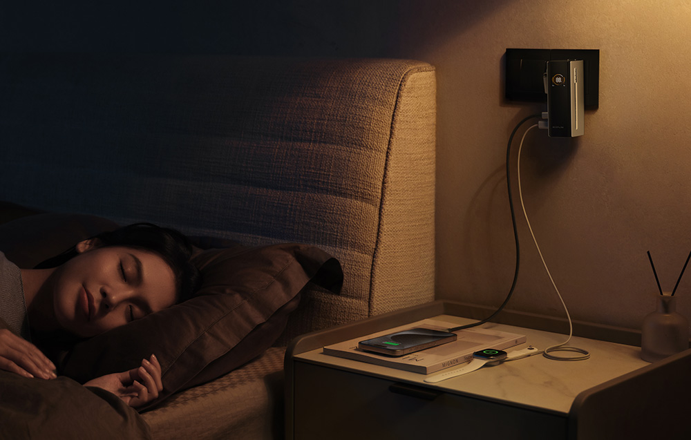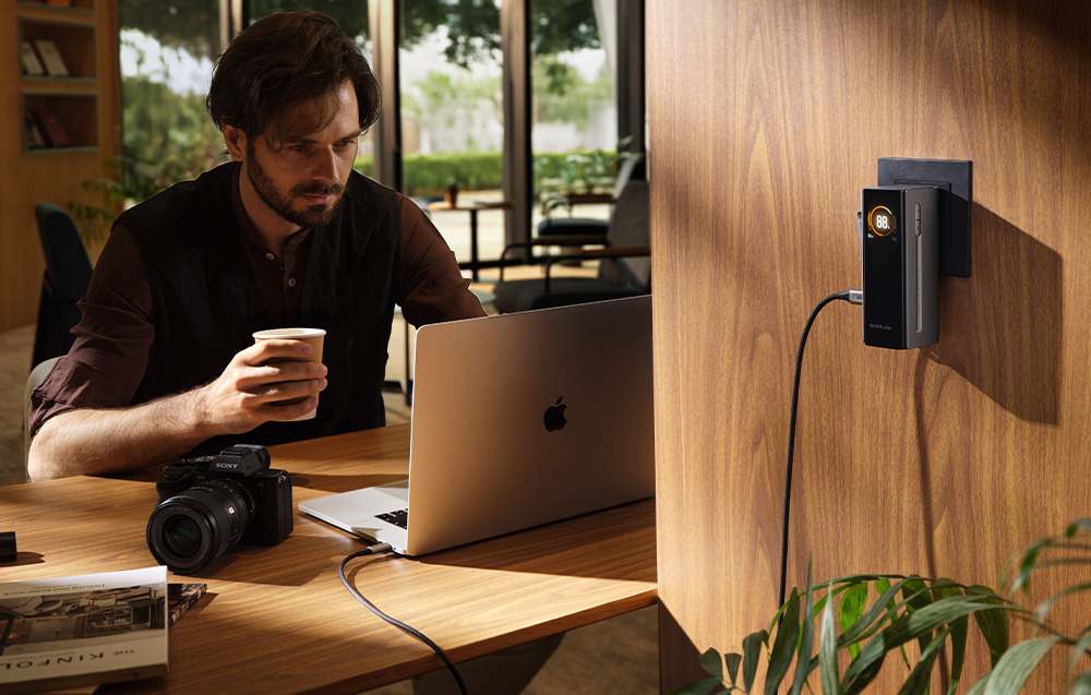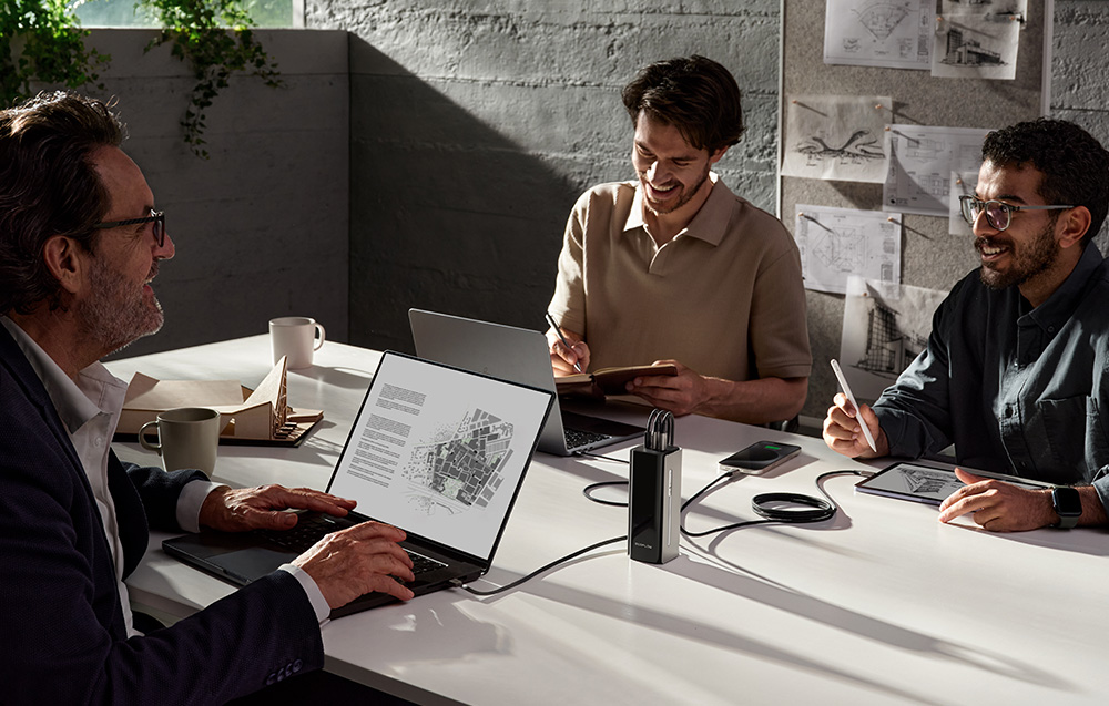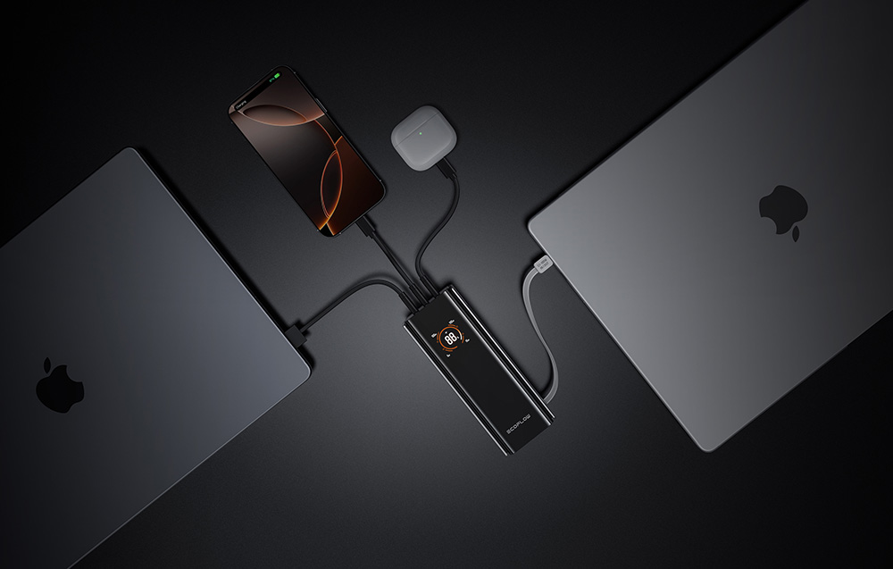 EcoFlow RAPID Pro umożliwia jednoczesne ładowanie nawet czterech urządzeń – dwóch laptopów, smartfona i tabletu – dzięki trzem portom USB-C i wbudowanemu kablowi. Maksymalna łączna moc wyjściowa wynosi 230 W, co pozwala na szybkie zasilanie MacBooków Pro, Steam Decka, iPhone’ów czy innych urządzeń wymagających dużej mocy. Wbudowany kabel obsługuje dwukierunkowe ładowanie 100 W, a dwa dodatkowe porty oferują do 65 W każdy, co gwarantuje pełną wydajność w każdej sytuacji.