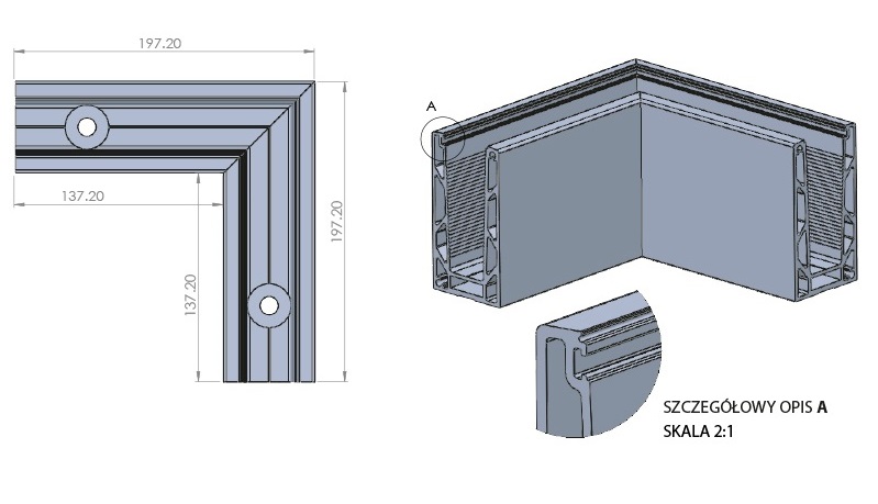 długość i szerokość: po 197 mm – równe ramiona zapewniają symetryczne oparcie szkła i wygodne rozplanowanie kotwień po obu stronach narożnika