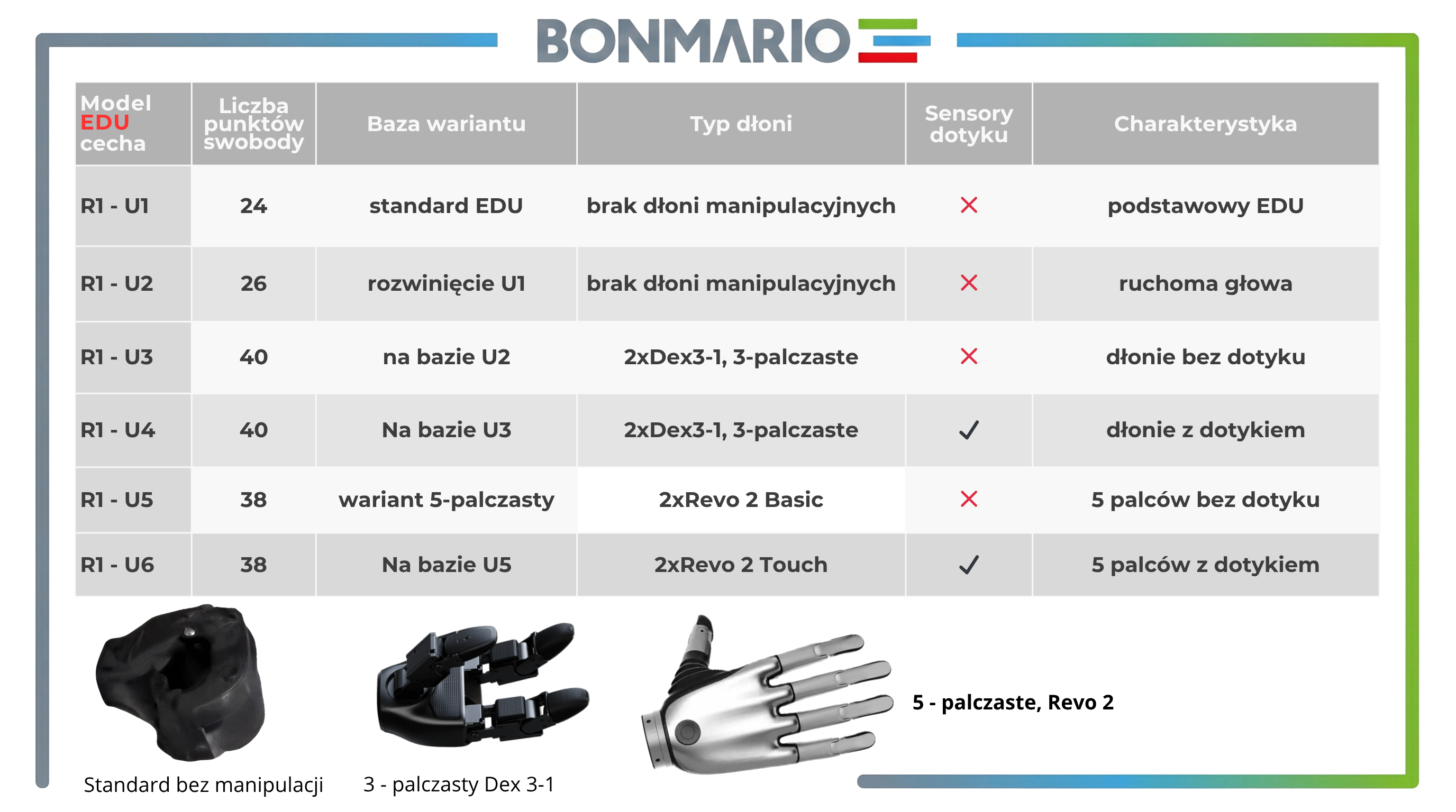| Stopnie swobody dłoni | 7 DoF na dłoń (kciuk: 3 DoF, palec wskazujący: 2 DoF, palec środkowy: 2 DoF) |