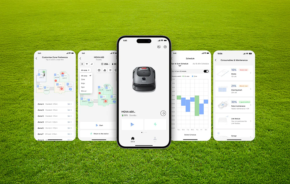 MOVA 600 korzysta z systemu UltraView, który łączy panoramiczne wykrywanie przeszkód 360° x 59° z zasięgiem do 30 m, co pozwala robotowi tworzyć szczegółową mapę terenu i poruszać się pewnie nawet w bardziej złożonych ogrodach. Robot potrafi omijać przeszkody, trzymać się wyznaczonych granic i pracować w trudniejszych warunkach, obsługując nachylenia do 45% oraz działając sprawnie także przy słabszym oświetleniu.