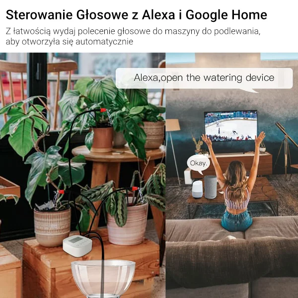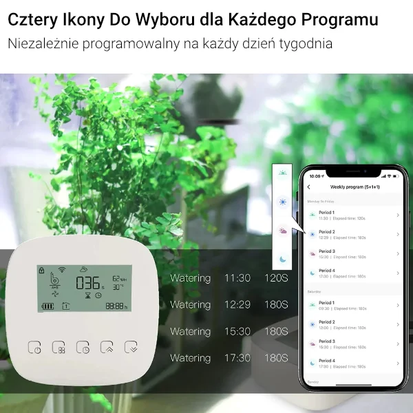 Dzięki aplikacji możesz zarządzać wieloma planami podlewania z dowolnego miejsca, a system powiadomień poinformuje Cię, gdy aktywują się tryby automatyczne lub gdy zabraknie wody. Urządzenie działa z aplikacją Tuya Smart i obsługuje komendy głosowe za pomocą Alexa oraz Google Home.