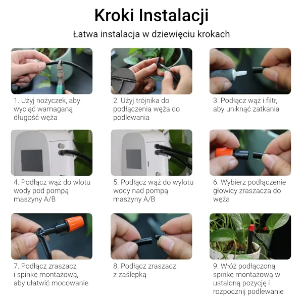 Urządzenie można podłączyć w sposób zupełnie niezależny lub jako element większego systemu, tworząc przemyślaną i inteligentną instalację. Do zestawu dołączono akcesoria, które umożliwiają dopasowanie różnych dysz do nawadniania kropelkowego czy natryskowego, co sprawia, że montaż DIY jest prosty i praktyczny.