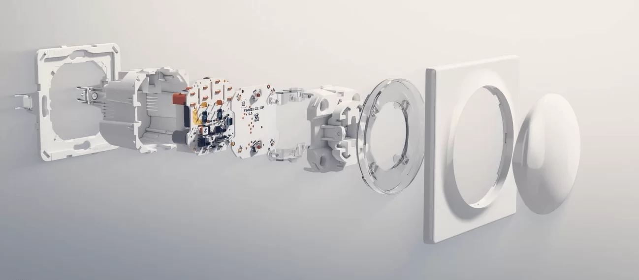 Okrągły przycisk z pierścieniem LED, który pasuje do linii gadżetów Fibaro Walli.