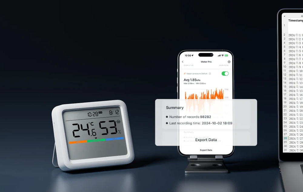 Meter Pro nie kończy swojej roli na bieżących wskazaniach. Wbudowana pamięć zapisuje dane nawet do 68 dni, a aplikacja przechowuje historię do 2 lat (wymagana rejestracja). Dzięki temu masz lokalne archiwum na ponad dwa miesiące oraz długoterminową historię w aplikacji bez dodatkowych opłat przez pierwsze dwa lata. Jeśli lubisz porównywać warunki w sezonach, obserwować trendy i sprawdzać, co wpływa na mikroklimat, to takie zbieranie danych jest po prostu wygodne i działa bez kombinowania z subskrypcjami.