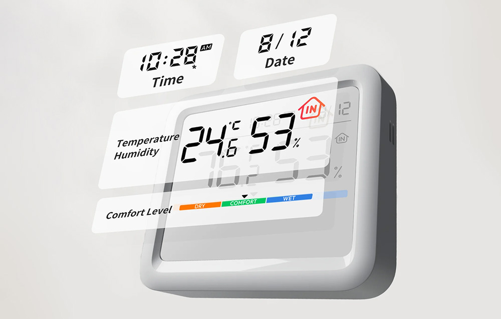 Gdy temperatura albo wilgotność przekroczą ustawione przez Ciebie wartości, Meter Pro uruchamia sygnał dźwiękowy i jednocześnie sprawia, że dane na ekranie zaczynają migać. To prosty, ale skuteczny alarm dźwiękowy oraz czytelne ostrzeżenie widoczne bez podchodzenia blisko urządzenia. Takie rozwiązanie szczególnie przydaje się tam, gdzie warunki mają realne znaczenie: w pokoju dziecka, spiżarni, piwnicy, a także w miejscu, w którym trzymasz rośliny i chcesz uniknąć przesuszenia lub zbyt wysokiej wilgotności.
