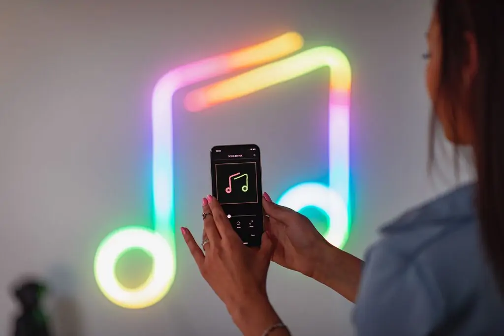 Instalacja Twinkly Flex jest wyjątkowo prosta – uruchomisz go w kilka sekund przez Bluetooth lub WiFi. W zestawie znajdują się uchwyty i klipsy montażowe, które umożliwiają dowolne kształtowanie listwy. Możesz nadać jej dowolny wzór – nuty, literę, maskotkę czy geometryczny kształt. Aplikacja Twinkly wykorzystuje aparat smartfona do mapowania położenia diod, co pozwala precyzyjnie odwzorować układ światła i tworzyć profesjonalne efekty wizualne bez potrzeby specjalistycznego sprzętu.