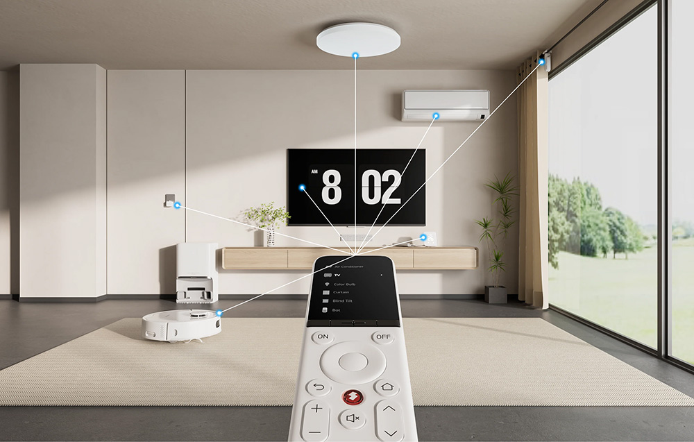 Na co dzień liczy się wygoda, dlatego zastosowano duży ekran LCD 2.4”, który wyraźnie pokazuje, czym aktualnie sterujesz. Do tego dochodzą spore, łatwe do wyczucia przyciski oraz dotykowe pokrętło, dzięki którym nawigacja jest szybka i naturalna, bez „klikania na ślepo”. Całość dobrze leży w dłoni, a kompaktowy format sprawia, że pilot pasuje na stolik, do szuflady albo do uchwytu na ścianie. W tej części najważniejsze są czytelny ekran 2.4” ułatwiający kontrolę oraz wygodne przyciski i pokrętło dotykowe do szybkiej obsługi.