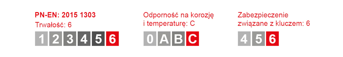 - ilość zastawek: 6 po obu stronach, wysoki poziom zabezpieczenia przed próbami otwarcia wytrychem,