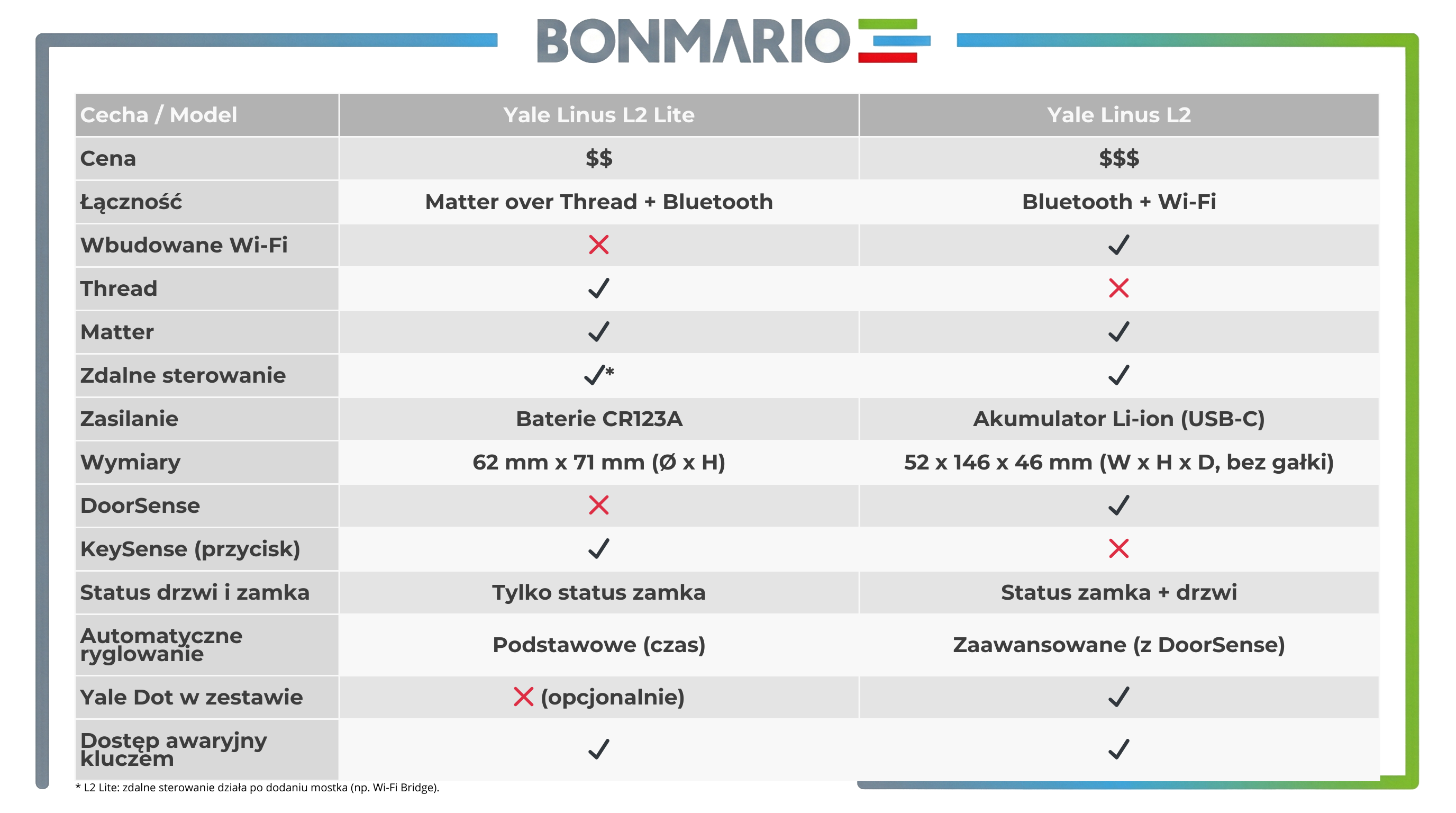 *Funkcje zdalnego sterowania i zaplanowanego ryglowania wymagają mostka Wi-Fi Yale ConnectX.