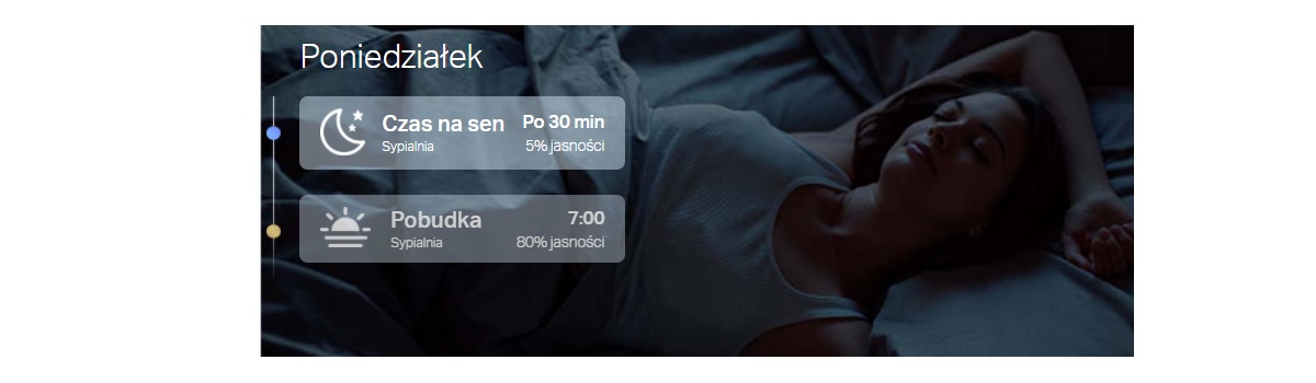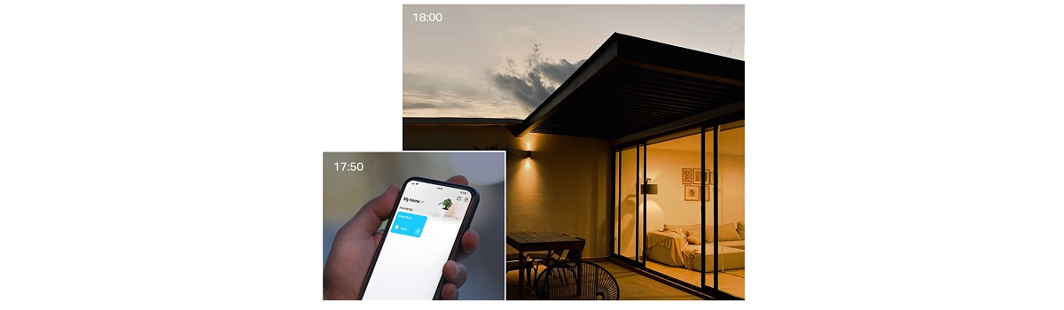 Możesz ustawić harmonogram, aby światło zapalało się i przygasało o konkretnych porach, bez codziennego klikania. Dodatkowo tryb wschodu i zachodu słońca dopasowuje działanie do Twojej strefy czasowej, więc oświetlenie może włączać się automatycznie wtedy, gdy faktycznie robi się ciemniej.