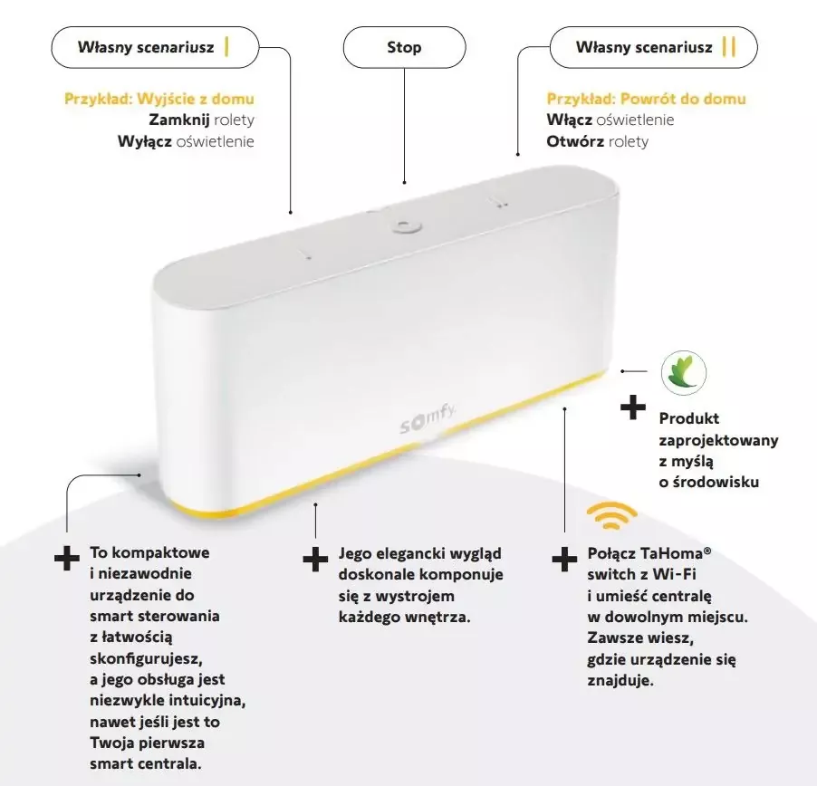 TaHoma Switch to nowoczesna centrala, która umożliwia zdalne sterowanie ponad 200 urządzeniami w domu z dowolnego miejsca na świecie. Obsługa protokołów radiowych RTS oraz io-homecontrol pozwala łatwo integrować kolejne urządzenia w ekosystemie inteligentnego domu. Dzięki błyskawicznym powiadomieniom możesz mieć pewność, że wszystkie zadania zostały wykonane zgodnie z planem. System pozwala również monitorować zużycie energii, pomagając uniknąć niepotrzebnych kosztów, na przykład przez wyłączenie pozostawionych grzejników lub świateł.